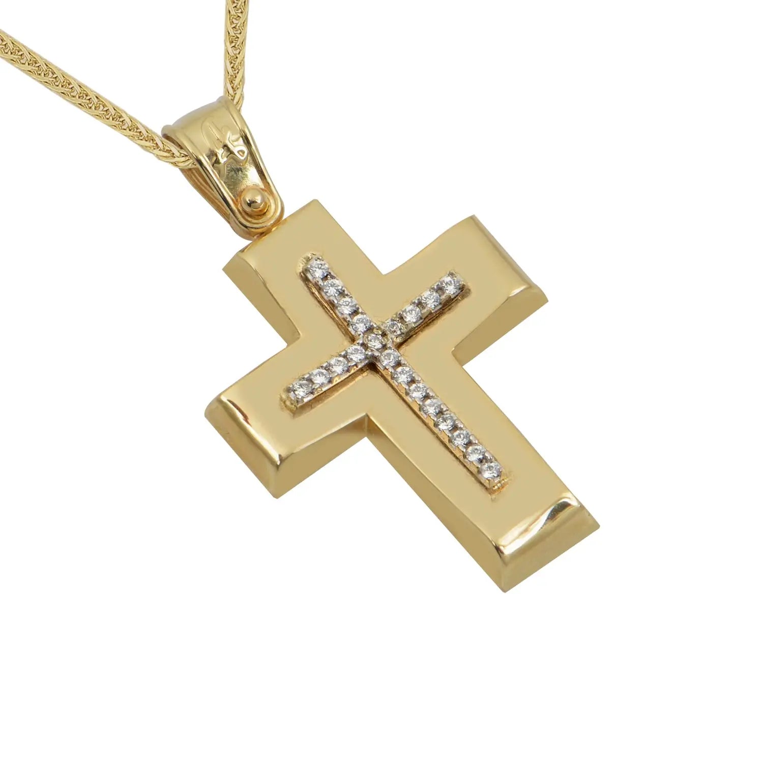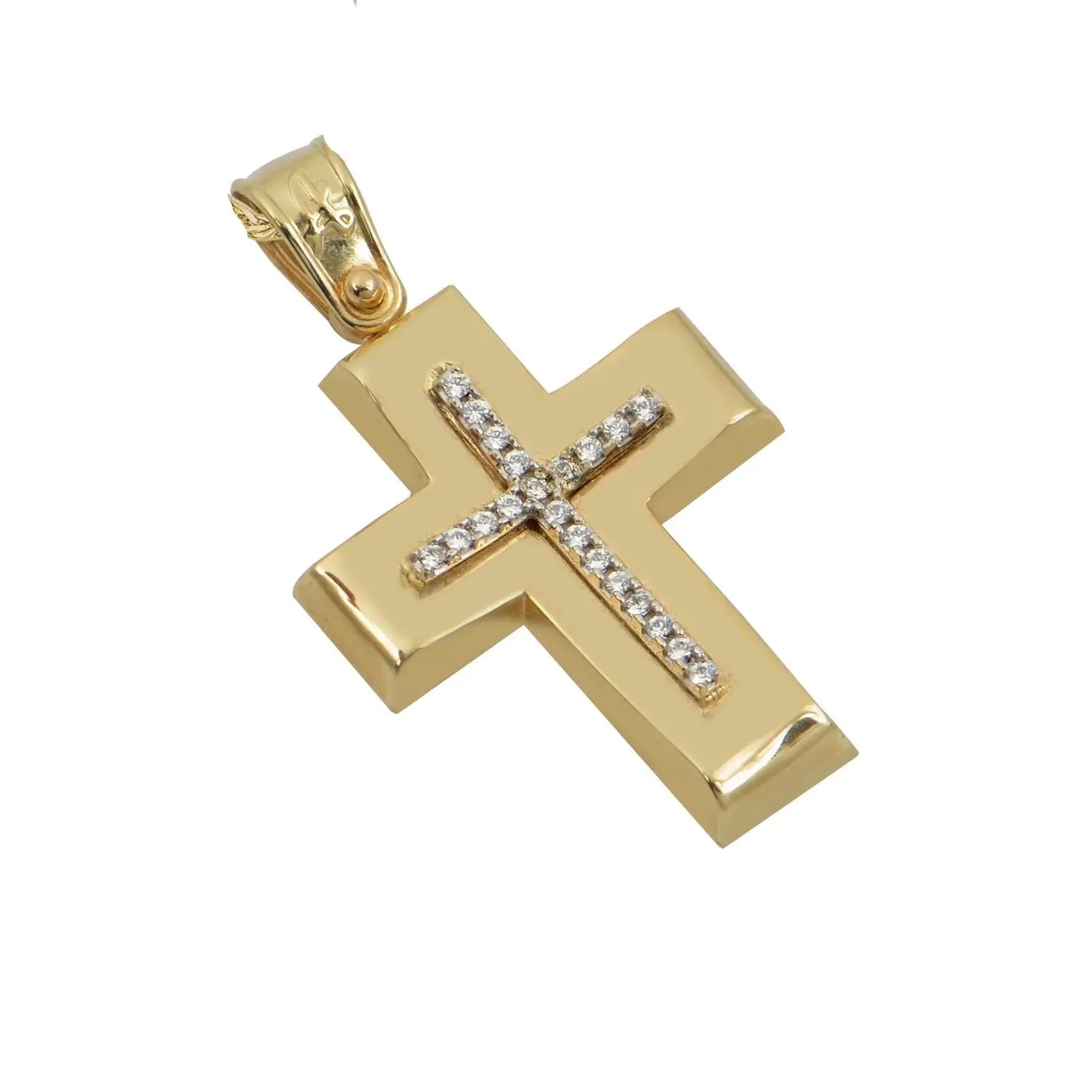 The impressive baptismal crosses is a 9-carat gold jewel, in gold color with white gold details and zircons that combines excellent quality and design. Suitable for baptism or a gift that will remain unchanged over time.
