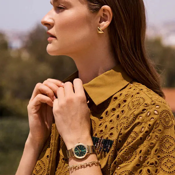 The women's Breeze watch, with its ultra-elegant aesthetics and special pattern, will upgrade even your most simple and everyday look. With glass made of mineral crystal , its shape is round and combined with the golden stainless steel bracelet , it is a super-cool watch.