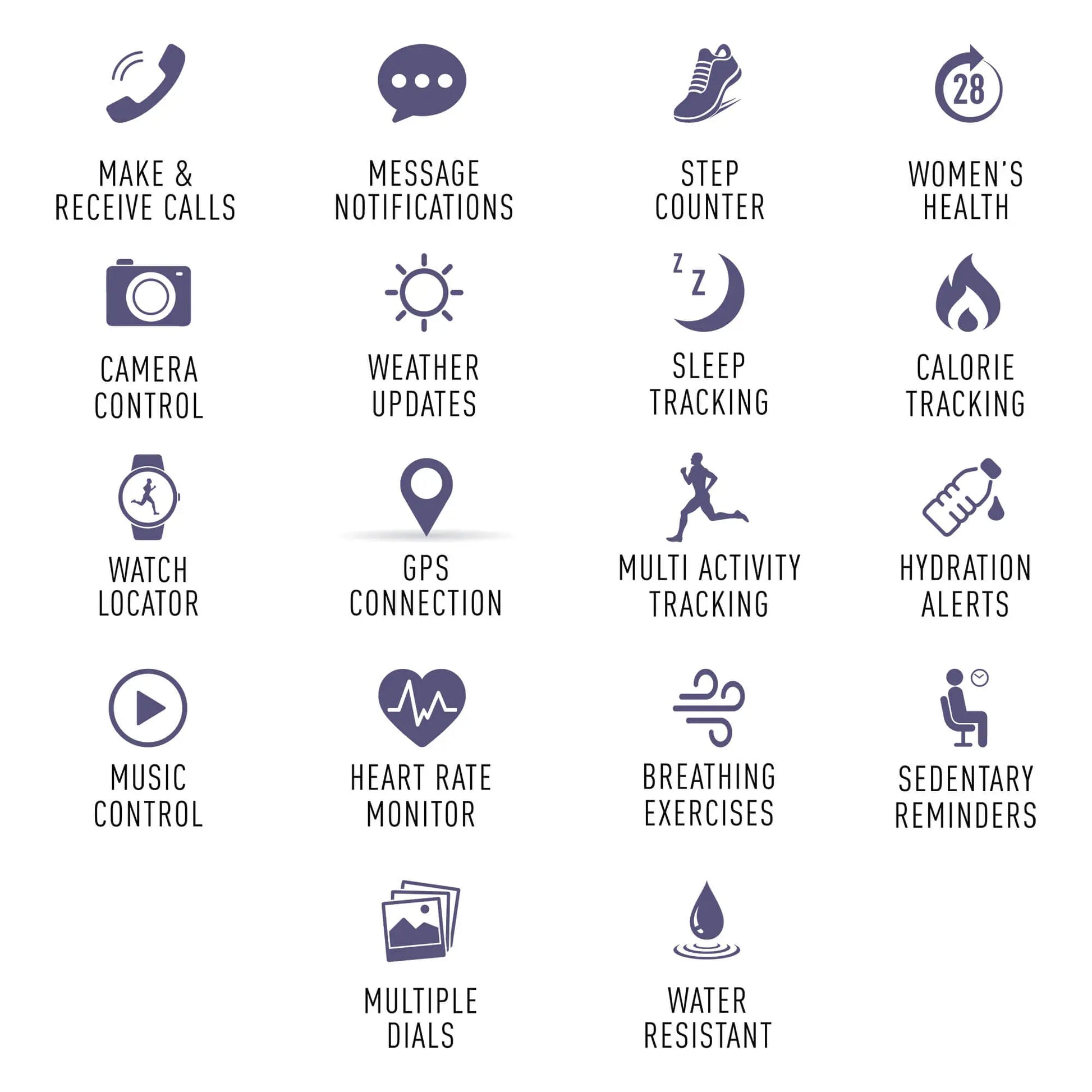Each watch is sold in a gift box and includes an instruction manual, USB charger (sealed rechargeable battery) and a 2-year manufacturer's warranty. Scratch resistant and waterproof only in accidental contact with water.