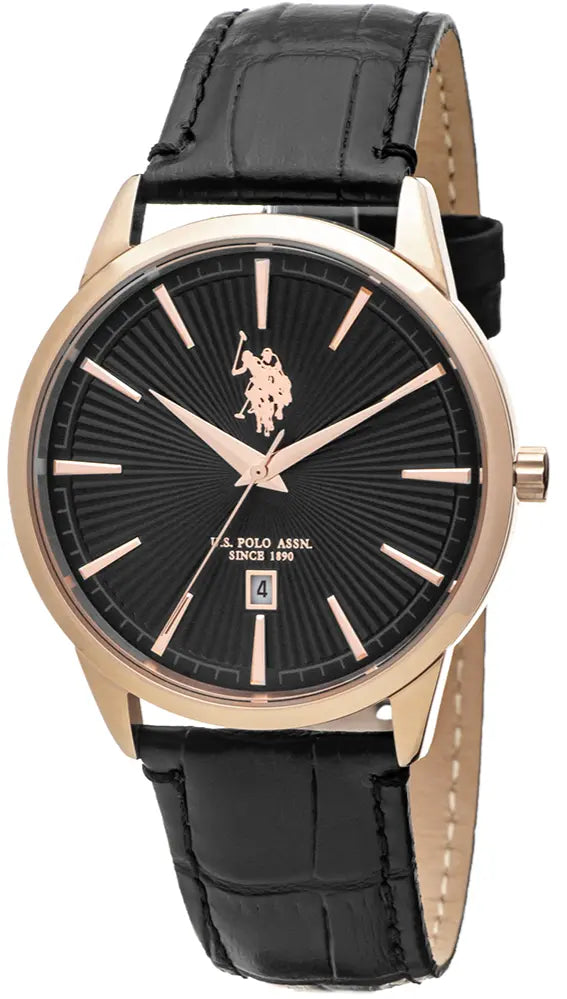 The U. S. Polo men's watch and its sporty air make it a timeless, yet original choice. With glass made of mineral crystal , exudes luxury and vintage aesthetics. The round shape of the case, combined with the black leather strap highlight the gold dial and elevate any look.