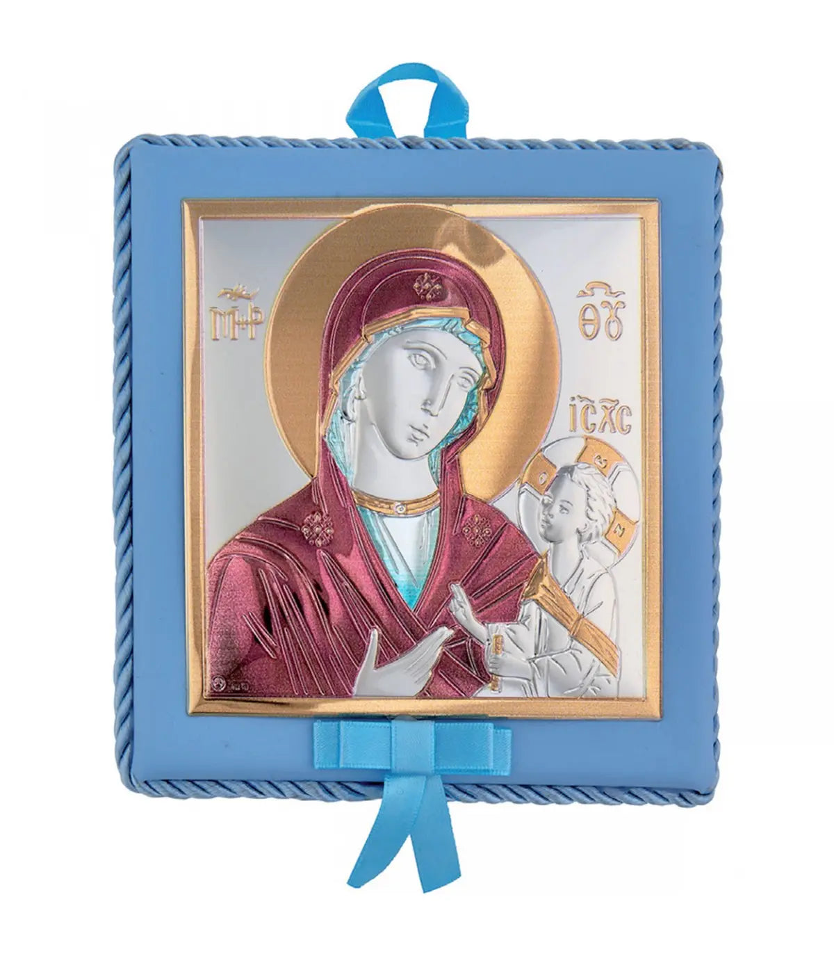 Το φυλαχτό για μωρά με Παναγία και Χριστό για νεογέννητο αγόρι με χρώμα από ασήμι που έχει επεξεργαστεί για να μην χάνει την λάμψη του.