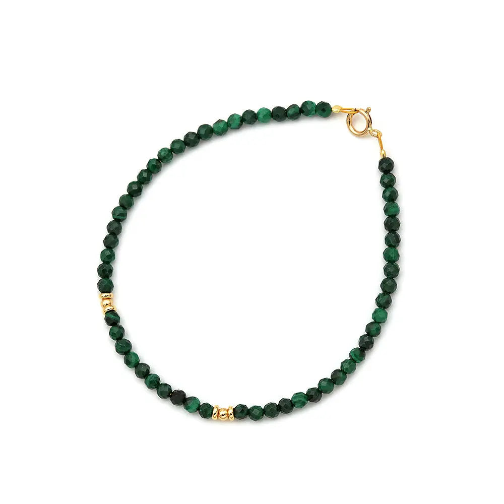 Το εντυπωσιακό γυναικείο βραχιόλι με μαλαχίτη πολυεδρικής κοπής διαμέτρου 3,0mm. Διαθέτει 2 χρυσές μπίλιες, 4 χρυσές ροδέλες 14ct και χρυσό κούμπωμα ασφαλείας 14ct.