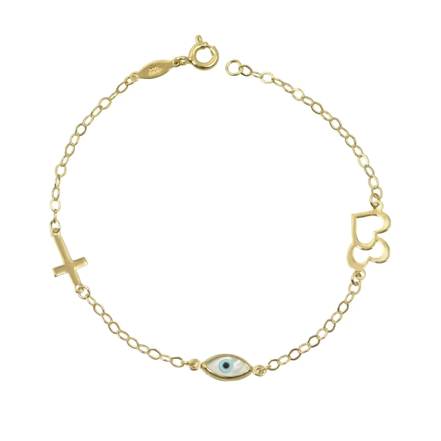 Το εντυπωσιακό παιδικό βραχιόλι είναι ένα κόσμημα από επιχρυσωμένο ασήμι 925, με καρδιά, σταυρό και ματάκι που συνδυάζει εξαιρετική ποιότητα και design. Κατάλληλο για δώρο που θα μείνει αναλλοίωτο στον χρόνο.