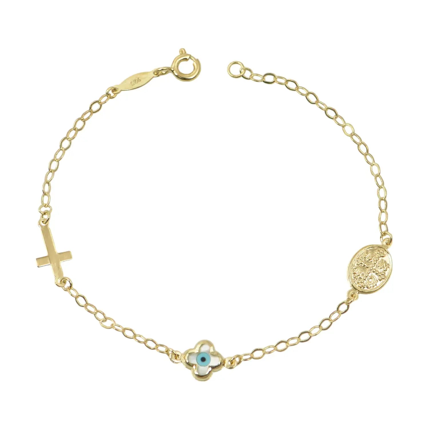 Το εντυπωσιακό παιδικό βραχιόλι είναι ένα κόσμημα από επιχρυσωμένο ασήμι 925, με Κωνσταντινάτο, σταυρό και ματάκι που συνδυάζει εξαιρετική ποιότητα και design. Κατάλληλο για δώρο που θα μείνει αναλλοίωτο στον χρόνο.
