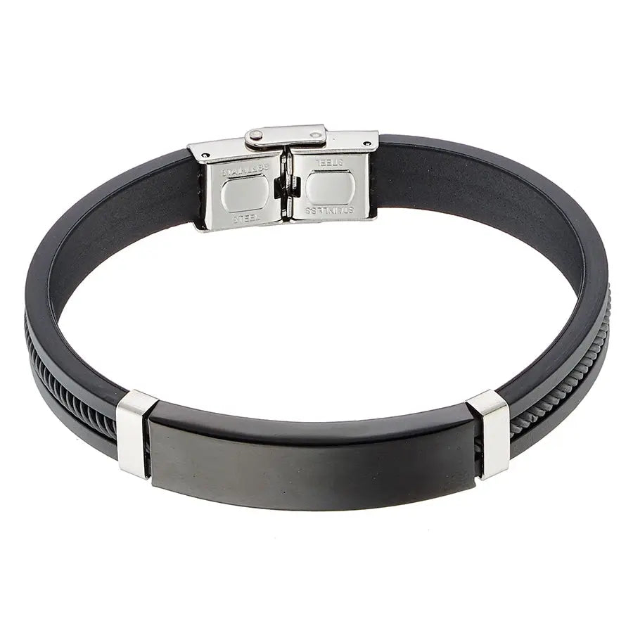 Το εντυπωσιακό ανδρικό βραχιόλι είναι ένα κόσμημα από ατσάλι και μαύρο καουτσούκ, σε μαύρο χρώμα που συνδυάζει εξαιρετική ποιότητα και design. Κατάλληλο για δώρο που θα μείνει αναλλοίωτο στον χρόνο.