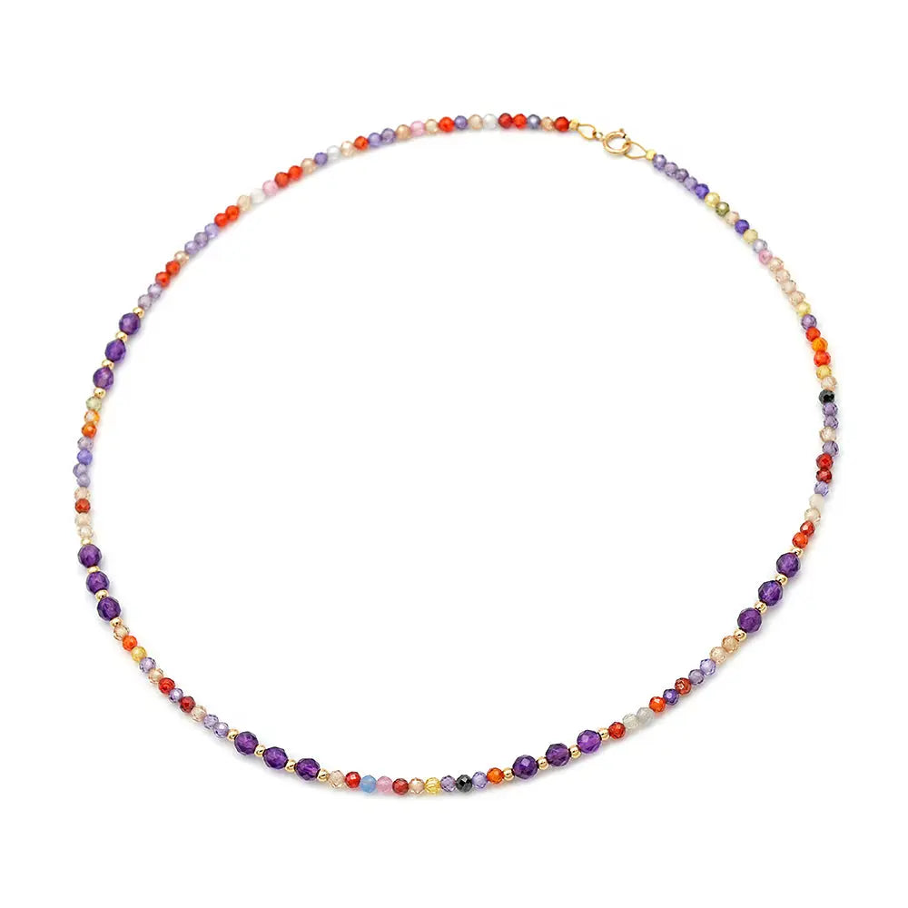 Το εντυπωσιακό γυναικείο κολιέ με πολύχρωμο αχάτη πολυεδρικής κοπής διαμέτρου 3,0mm και αμέθυστο πολυεδρικής κοπής διαμέτρου 4,0-4,5cm. Διαθέτει επίσης 20 χρυσές μπίλιες 14ct και χρυσό κούμπωμα ασφαλείας 14ct.
