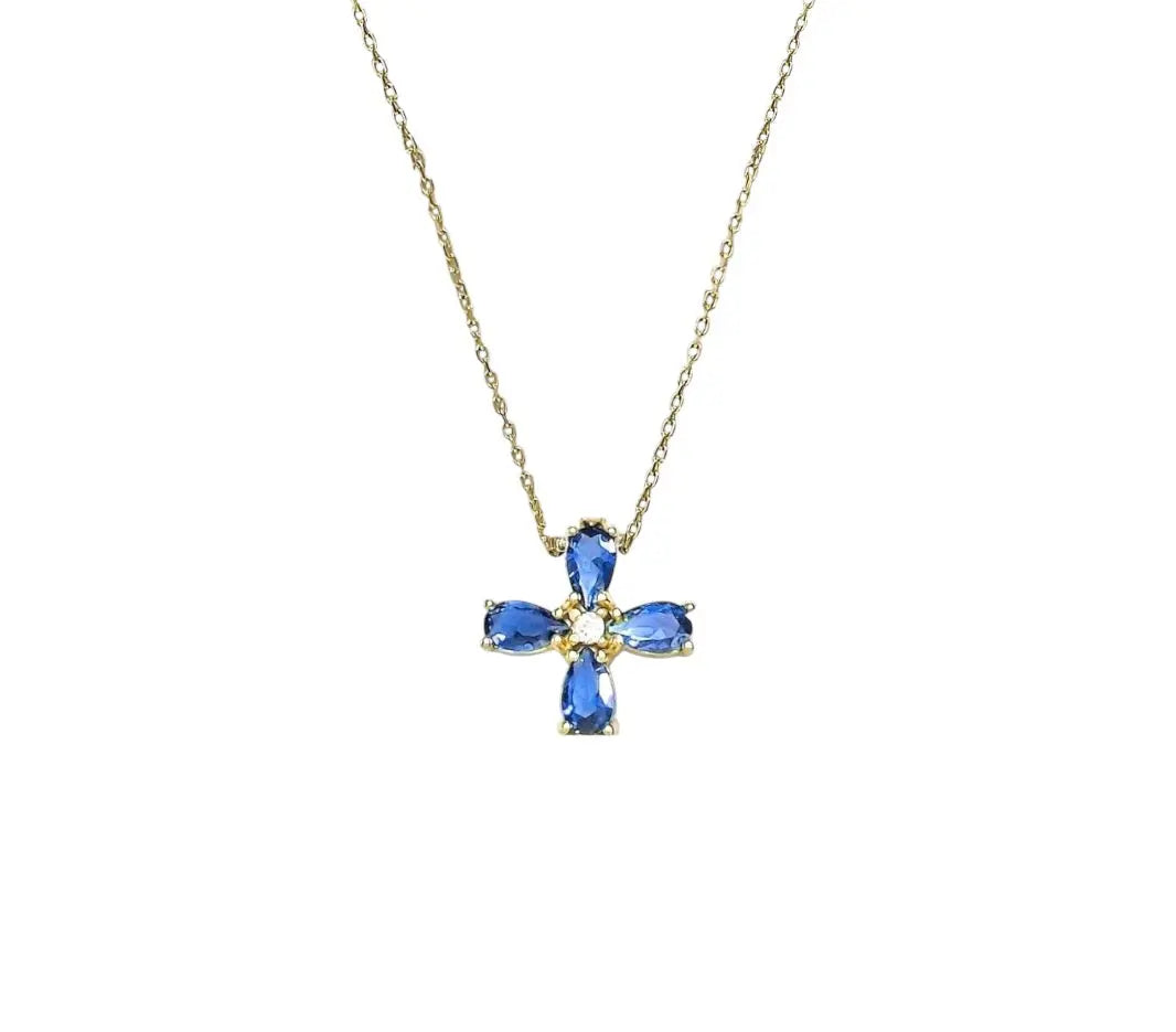 Το γυναικείο κόσμημα κολιέ σε σχήμα σταυρού είναι φτιαγμένο από επιχρυσωμένο ασήμι με γαλάζια ζιργκόν, που συνδυάζει εξαιρετική ποιότητα και design.