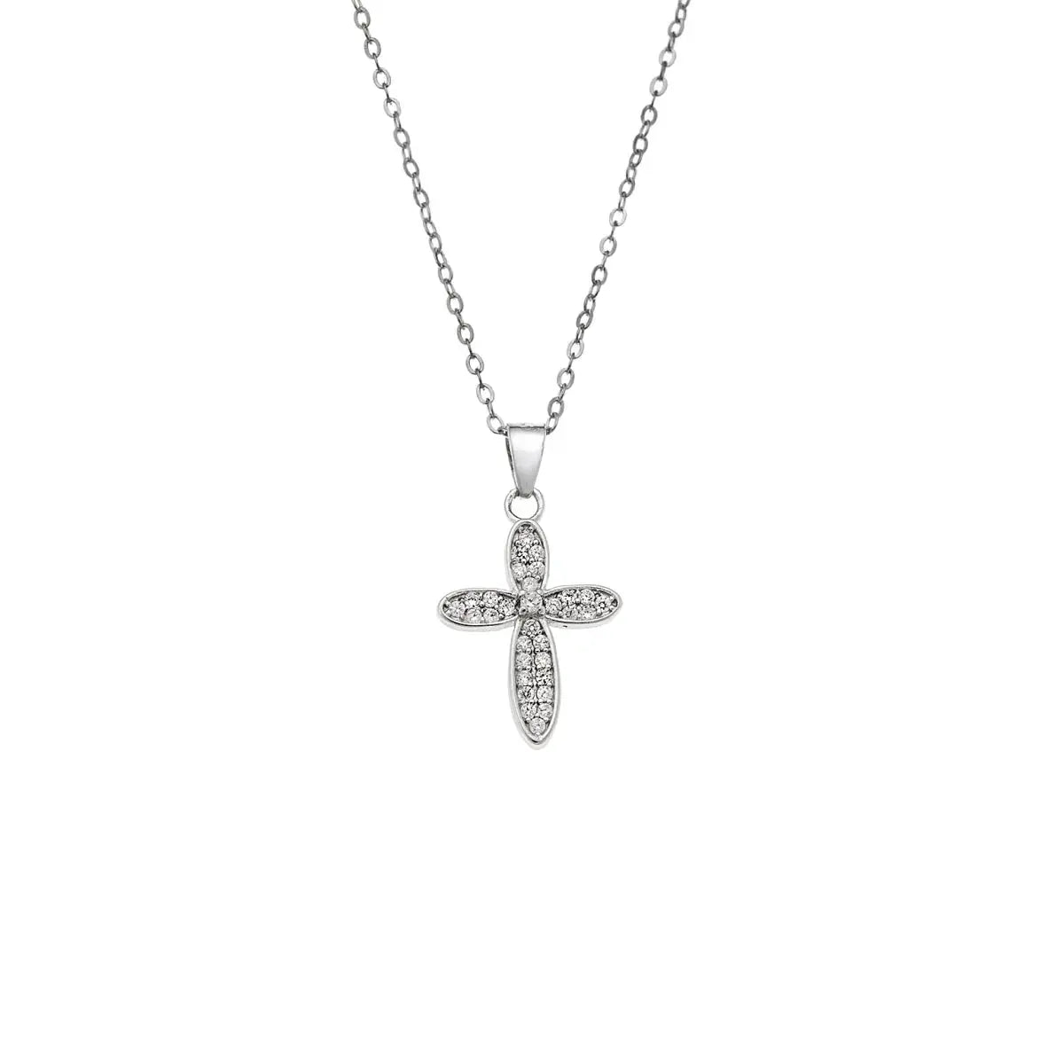 Το γυναικείο κόσμημα κολιέ σταυρός είναι φτιαγμένο από επιπλατινωμένο ασήμι με ζιργκόν, που συνδυάζει εξαιρετική ποιότητα και design.