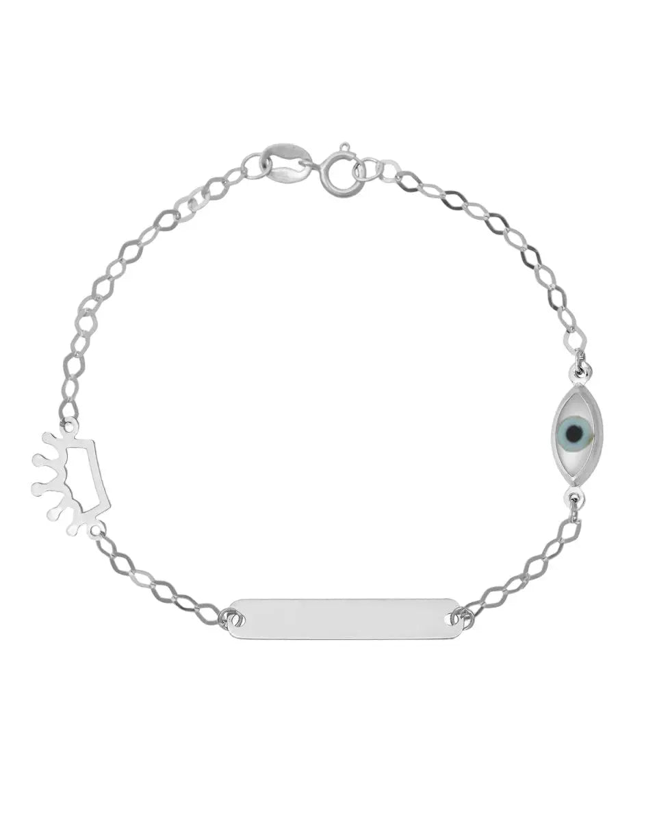 Το εντυπωσιακό παιδικό βραχιόλι ταυτότητα είναι ένα κόσμημα από χρυσό 9 καρατίων, σε χρώμα λευκόχρυσου με ματάκι και κορώνα που συνδυάζει εξαιρετική ποιότητα και design. Κατάλληλο για δώρο που θα μείνει αναλλοίωτο στον χρόνο.