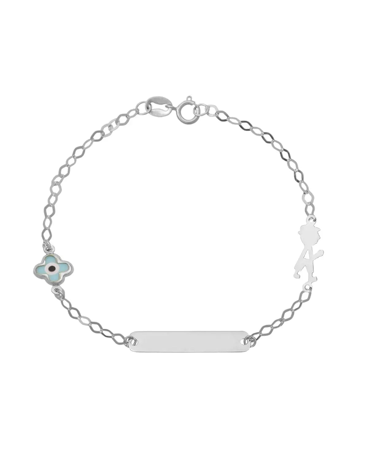 Το εντυπωσιακό παιδικό βραχιόλι ταυτότητα είναι ένα κόσμημα από χρυσό 9 καρατίων, σε χρώμα λευκόχρυσου με μπλε ματάκι και αγοράκι που συνδυάζει εξαιρετική ποιότητα και design. Κατάλληλο για δώρο που θα μείνει αναλλοίωτο στον χρόνο.