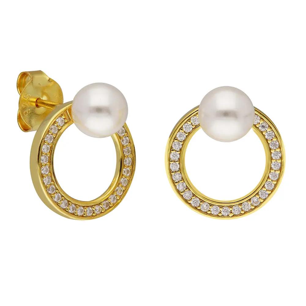 BRIZZLING BME194-D Σκουλαρίκια από Επιχρυσωμένο Ασήμι με Πέρλες & Διαμάντι Μοϊσανίτη