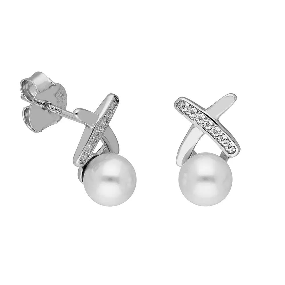 BRIZZLING BME211 Σκουλαρίκια από Επιπλατινωμένο Ασήμι με Πέρλες & Διαμάντι Μοϊσανίτη