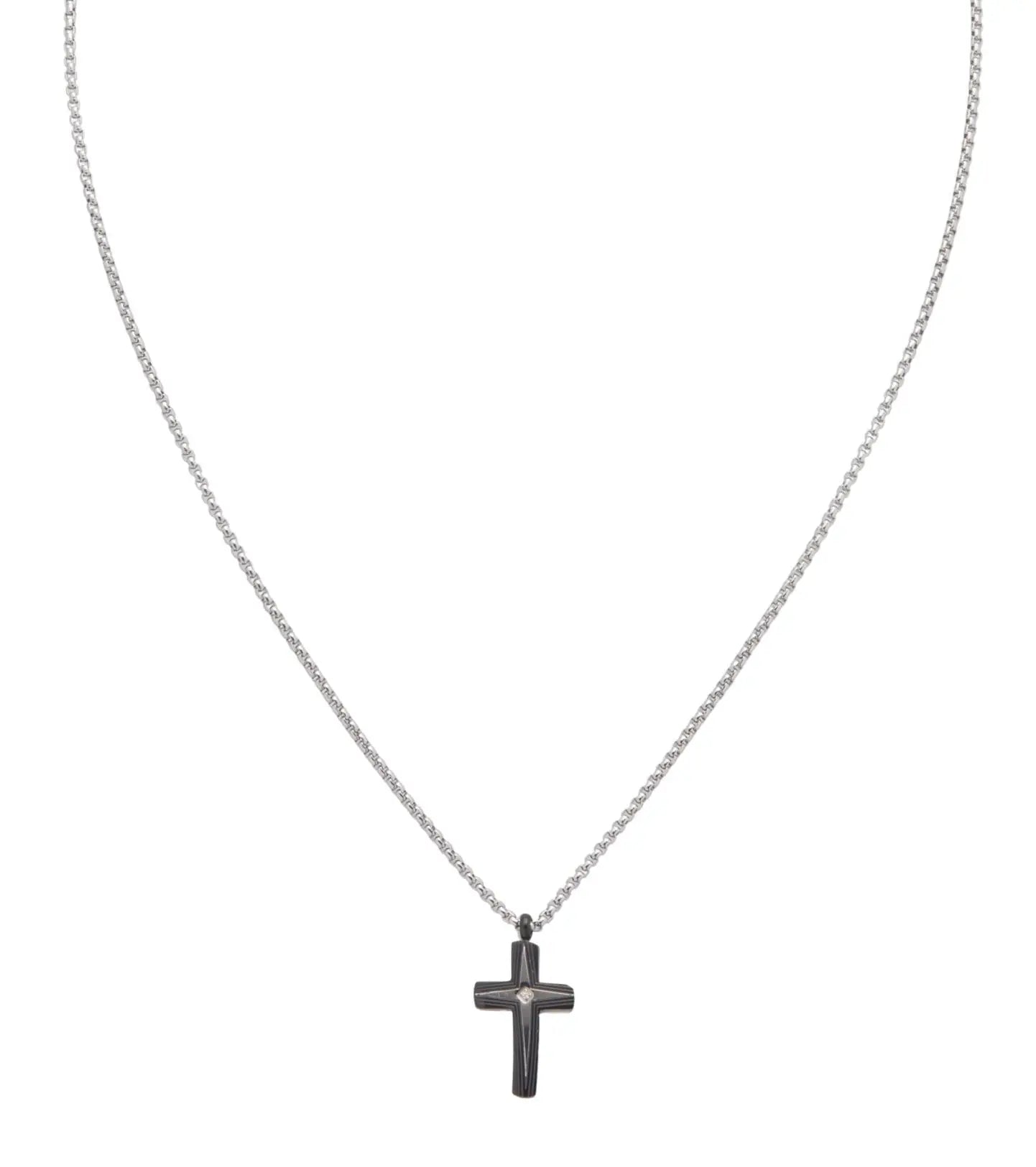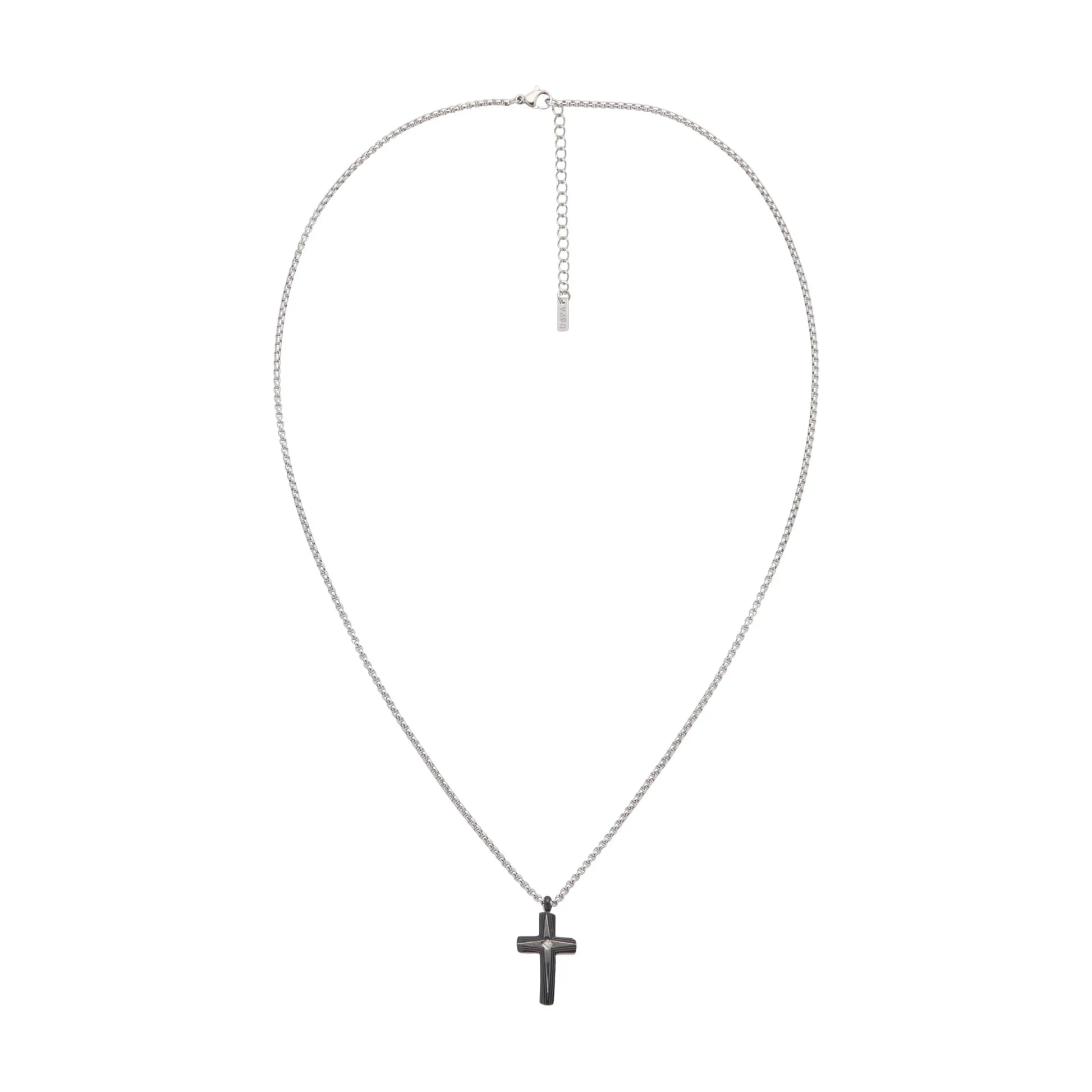 Το ανδρικό κόσμημα κολιέ σε σχήμα σταυρού είναι φτιαγμένο από ατσάλι σε ασημί χρώμα, που συνδυάζει εξαιρετική ποιότητα και design.